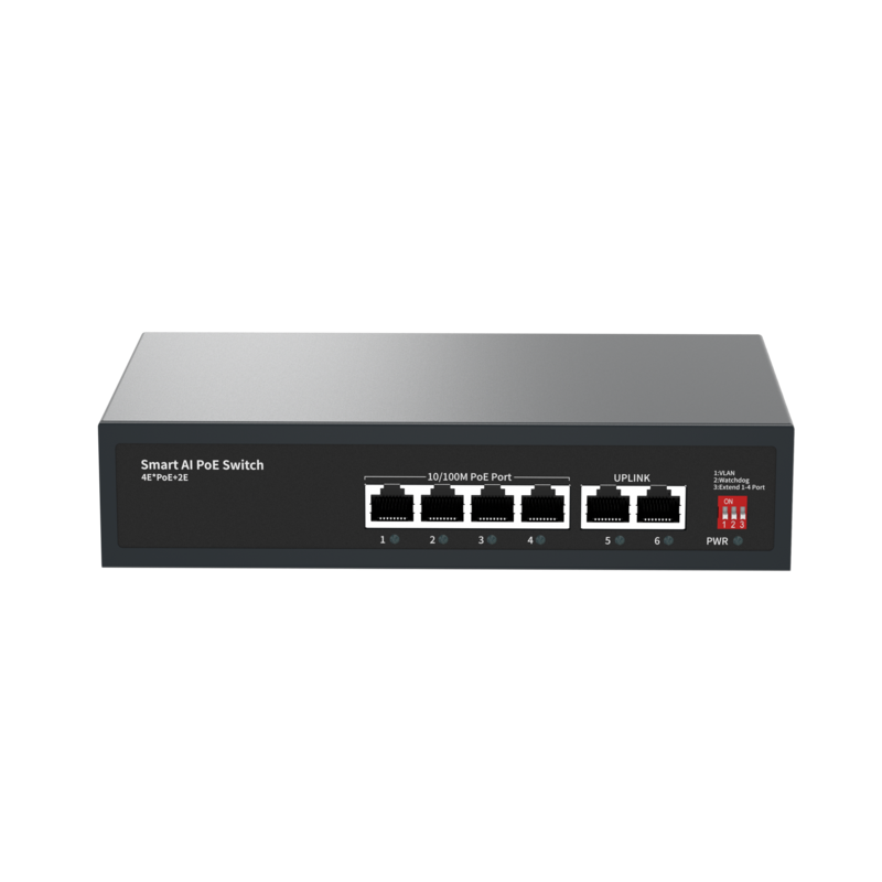 The JXF0402P series is a non-managed Smart PoE Switch. It utilizes high-performance non-blocking enterprise-grade network switch IC and standard PoE chips. It has 4 Fast Ethernet PoE ports + 2 Fast Ethernet uplink ports, providing seamless connectivity for 10/100M Ethernet networks. Ports 1-4 support IEEE 802.3af/at standard PoE power supply, single-port PoE power output of up to 30W. All service ports offer 4kV surge protection. The switch incorporates multiple AI features, including one-touch Port VLAN, PoE Watchdog for automatic fault recovery, and 200-meter extended distance transmission. These features ensure efficient network deployment, reduce operational costs, and make it ideal for building cost-effective networks in scenarios such as security surveillance, safe cities, schools, campuses, hotels, banks, hospitals, government/enterprise offices, scenic areas, shopping malls, and small-to-medium businesses.